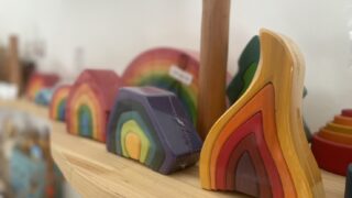ショップでは、体と心にやさしい木のおもちゃや、美しい色合いのクレヨン、色鉛筆など、