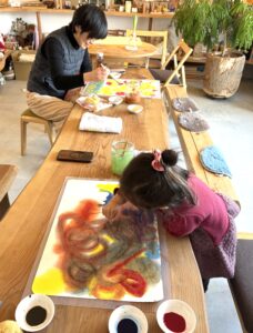 大人は、3色で虹を描きました。2枚目は「自由に!」。子どもは大喜びですが大人は「自由って言われると困る~」と思うのが大人です。自分は何を描きたいのかを考え、色と向き合うことは、自分に向き合う時間になります。子どもも大人も、絵を描いている時間だけでなく、あとからじんわり日常生活の中で色の力を感じてもらえることと思います。