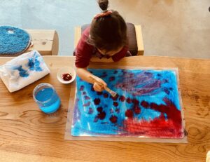 赤色が好きというひなみちゃん。回を重ねて準備や筆の運びができるようになり、ぬらし絵の色と色との出会いを楽しんでいます。